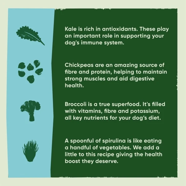 This natural, nutritiously healthy food is made in a more eco conscious way. We only use fresh, sustainably sourced, high quality ingredients which are better for your pet and better for the environment. Our recipe is crammed with natural prebiotics and superfoods like kale, chickpeas, pumpkin, and chicory root helping your dog’s digestion and immune system. Kale is one of the world’s most nutrient-dense foods. It is a fantastic anti-oxidant and is packed with lots of Vitamin A, helping your dog’s urinary health. Chicory is a world-class prebiotic and source of inulin which is good for digestion and bone health. Pumpkin is super-nutritious for your dog; it’s a rich source of fibre and is loaded with lots of disease-fighting nutrients including potassium, magnesium, and vitamins C & E.Every bag carries a money-back guarantee with its ‘Naturally Delicious’ mark.