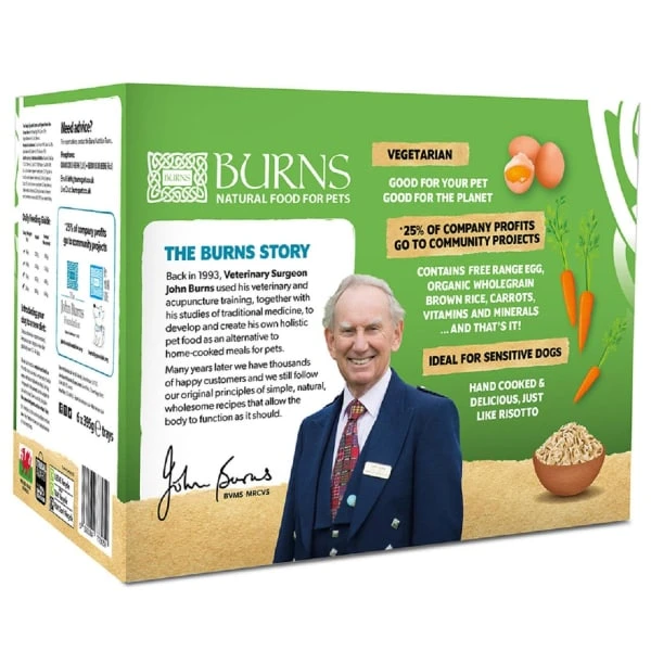 Responsibly sourced to support British and Irish farmers, the Burns Free-Range Egg with Carrots & Organic Brown Rice is a sustainable vegetarian option which allows dogs to go meat free while reaping the benefits of highly digestible egg protein. This simple, natural recipe is hypoallergenic, gluten free and made using a single protein source, making it suitable for adult and senior dogs of any breed and sensitive dogs. Previously known as Penlan Farm, our complete wet food contains free range egg, organic wholegrain brown rice, carrots, vitamins and minerals, with no hidden surprises, ensuring your dog is getting only the very best.