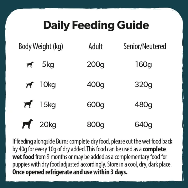 Hand cooked in Wales and made with responsibly sourced ingredients, the Burns Organic Chicken with Carrots & Organic Brown Rice is the perfect convenient alternative to home cooking. This healthy dog food is hypoallergenic, gluten free and made using natural ingredients and single source protein, making it suitable for adult and senior dogs of any breed, fussy eaters and even the most sensitive dogs. Previously known as Penlan Farm, this complete wet food contains only wholesome ingredients such as organic chicken, organic wholegrain brown rice, carrots, vitamins and minerals, with no hidden surprises, ensuring that your dog is getting only the very best.