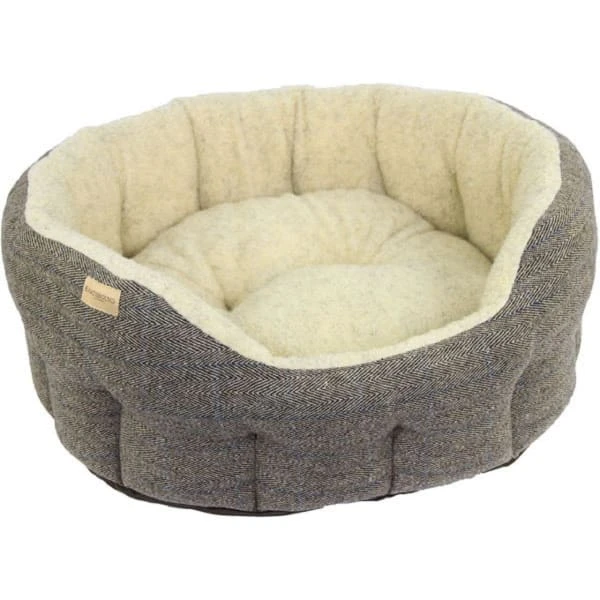 The Traditional Tweed bed has a luxurious look with a polyester waterproof base. The outside fabric is Tweed and the inside is soft and cosy sherpa. The Inner cushion is removable and reversible. One side is tweed and one side is soft and cosy sherpa. The Classic Bed range stand out from the market as they use thermal bonded Polyester Staple Fibre within the walls of the bed made from the highest quality of synthetic raw materials. This makes the walls not only very comfortable but very strong and rigid to prevent them from collapsing and protecting your pet from any draft.