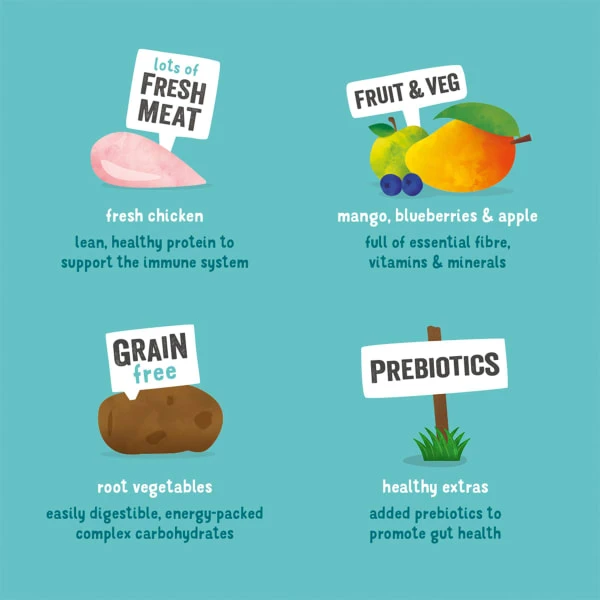 We only use fresh meat in our kibble – meaning nothing processed or dried, and absolutely no meal or bone. By mixing in a few tasty extras, like lots of healthy fruit, veg and berries, we’ve created a well-balanced kibble that gives dogs everything they need. Carefully baked at a low temperature, we lock in the goodness and make it easily digestible. Packaged in 100% biodegradable bags, its naturally tasty dog food that you, your pets and our planet can feel good about.Please note the 12kg bag contains large kibble.