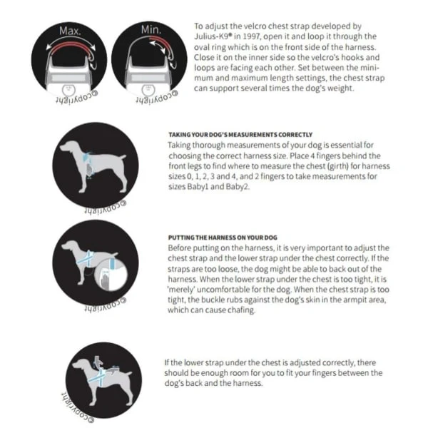 To adjust the velcro chest strap developed by Julius-K9® in 1997, open it and loop it through the oval ring which is on the front side of the harness. Close it on the inner side so the velcro’s hooks and loops are facing each other. Set between the minimum and maximum length settings, the chest strap can support several times the dog’s weight.
