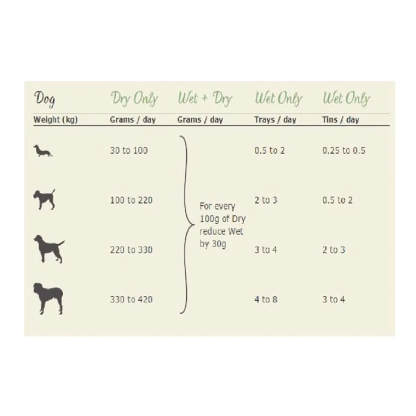 Only real meat: no rendered animal parts, carcass or derivatives, nothing genetically modified, no artificial preservatives, colours, taste enhancers or sweeteners. No wheat, corn or soya. We use only wholesome meats, grains, herbs – roots, flowers and leaves, fruit and vegetables – to produce a delicious, nutritious, digestible food for your dog.