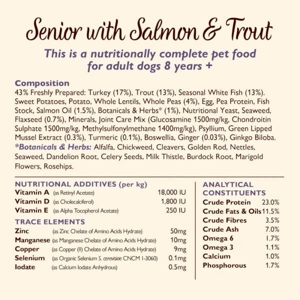 Made with 43% delicious turkey, trout and white fish, this grain free recipe is packed with the highest levels of joint care supplements to give your wise and wonderful friend the most nutritious dinner around.