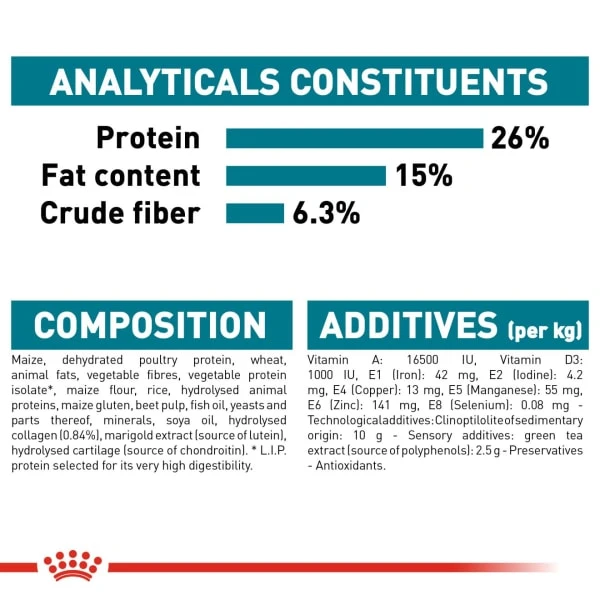 Complete feed for dogs – For adult and mature large breed dogs (from 26 to 44 kg) – Over 15 months old – Dogs prone to joint sensitivity.